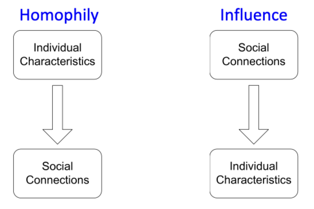 Influence(영향력)은 개별 Node의 특성이 다른 이웃 Node에 전파되어 영향을 미치게 된다는 이론이며, Network 내의 연결이 각 Node의 특성으로 이어짐을 의미한다. 예를 들자면 내가 친구에게 어떤 음악을 추천하고 친구가 그 음악을 좋아하게 되는 경우를 말할 수 있으며, 이러한 Influence는 Social Network에서 특히 많이 나타나는 현상이다.