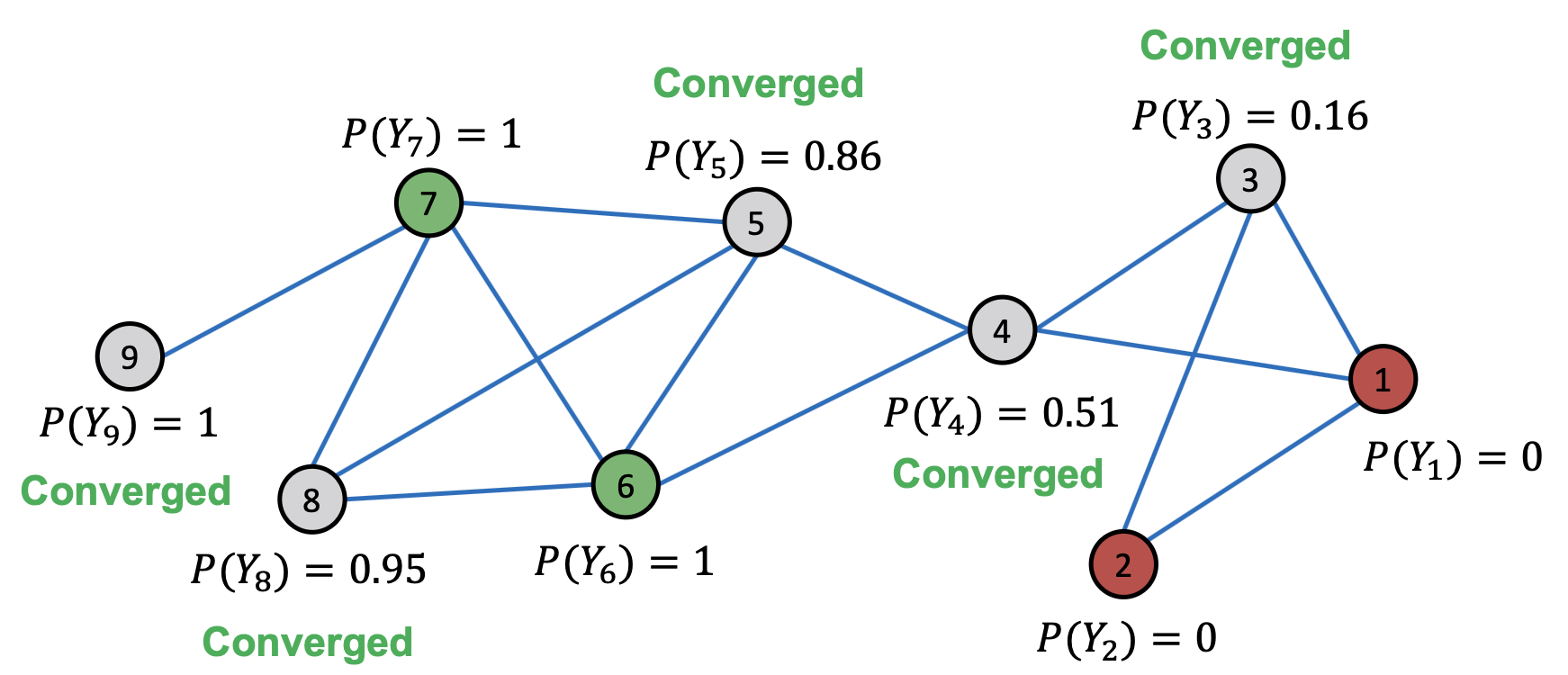 이러한 과정을 모든 Unlabeled Node에 대해 수행하고, 확률값이 수렴하게 되면(또는 최대 반복 횟수에 도달하면) 업데이트를 멈추고 확률값에 따라 Class를 구분할 수 있다. 아래 그림에서는 1/4/5/8번 Node의 Class=1() 이고, 3번 Node의 Class=0() 임을 알 수 있다.