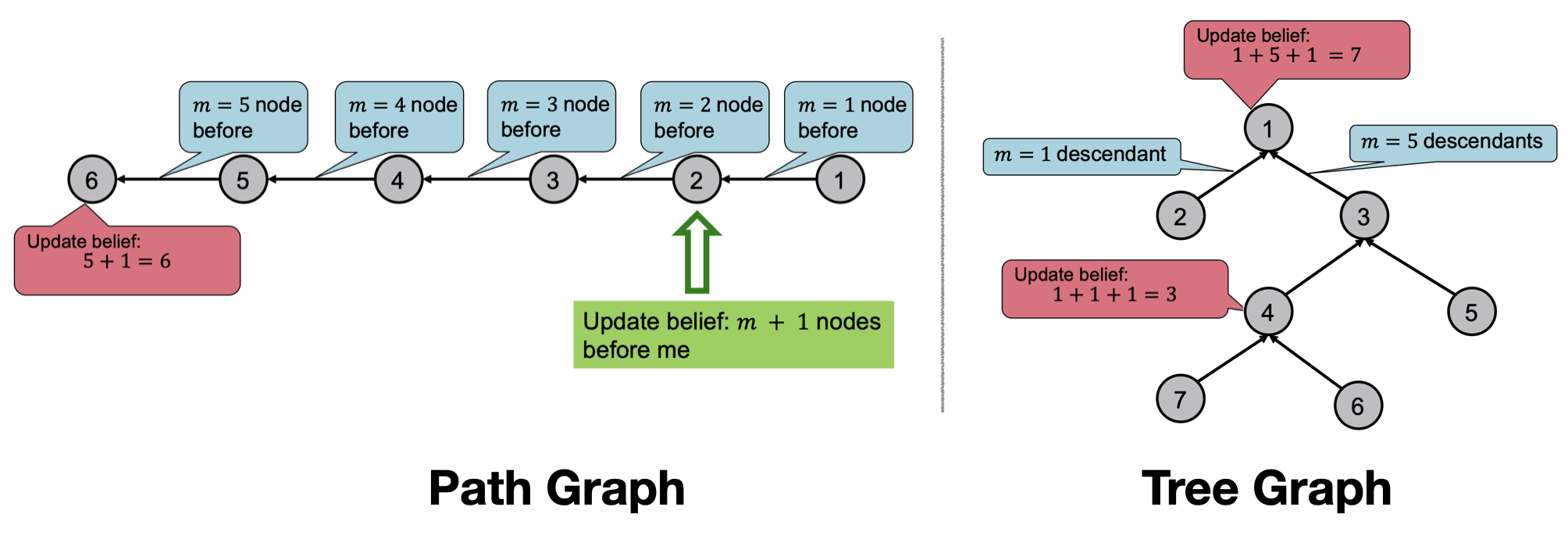각 Node에서는 Update Belief 동작이 일어나며, 이 때 이전 Node의 Message와 현재 Node의 정보를 결합해서 Belief를 계산한다. Path 구조에서는 In-Link에서 Out-Link 방향으로 진행되며 Tree 구조에서도 마찬가지로 In-Link(Leaves)에서 Out-Link(Root) 방향으로 Message Passing이 진행된다.