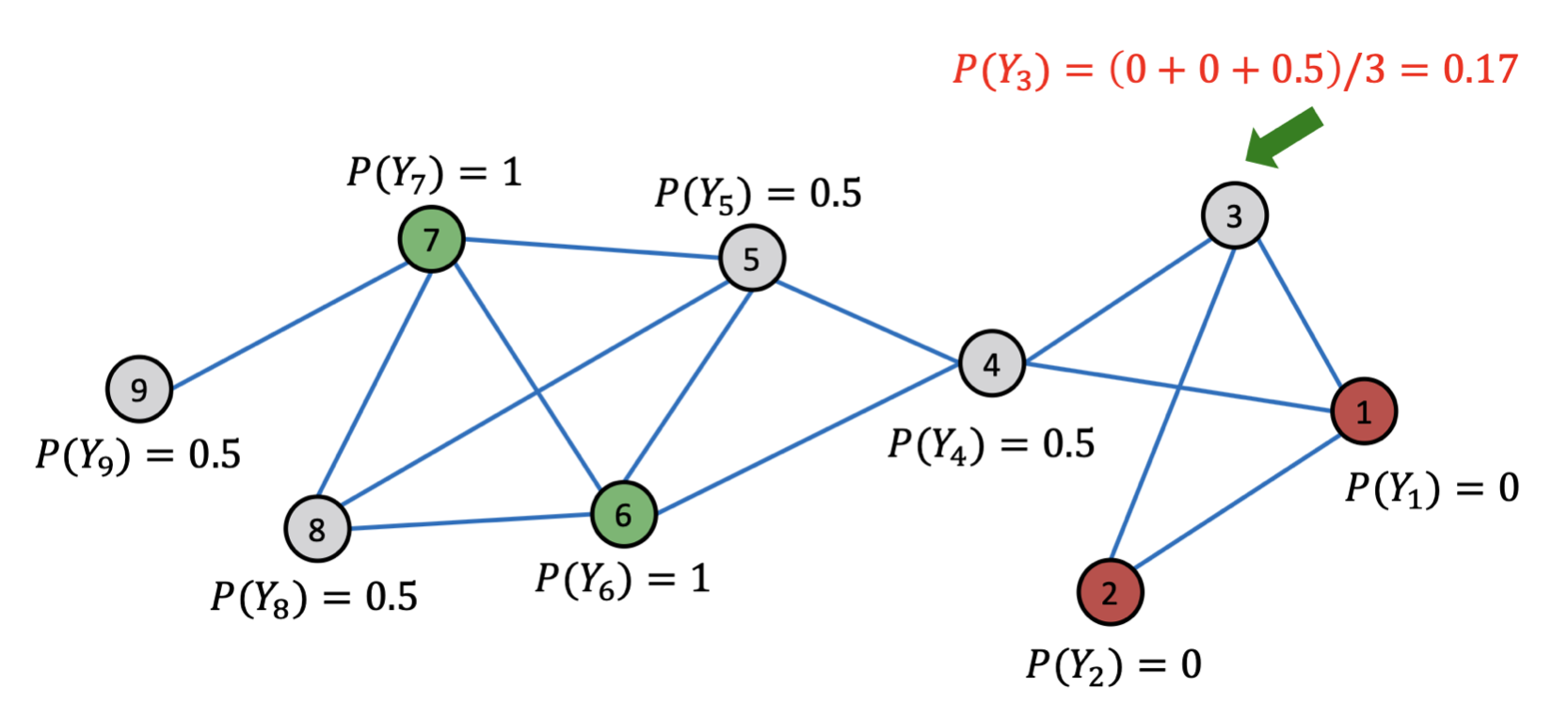 아래 그림에서 3번 Node의 경우, 연결된 1/2/4번 Node의 Class를 활용하여 3번 Node의 Class에 대한 확률 값을 업데이트한다.