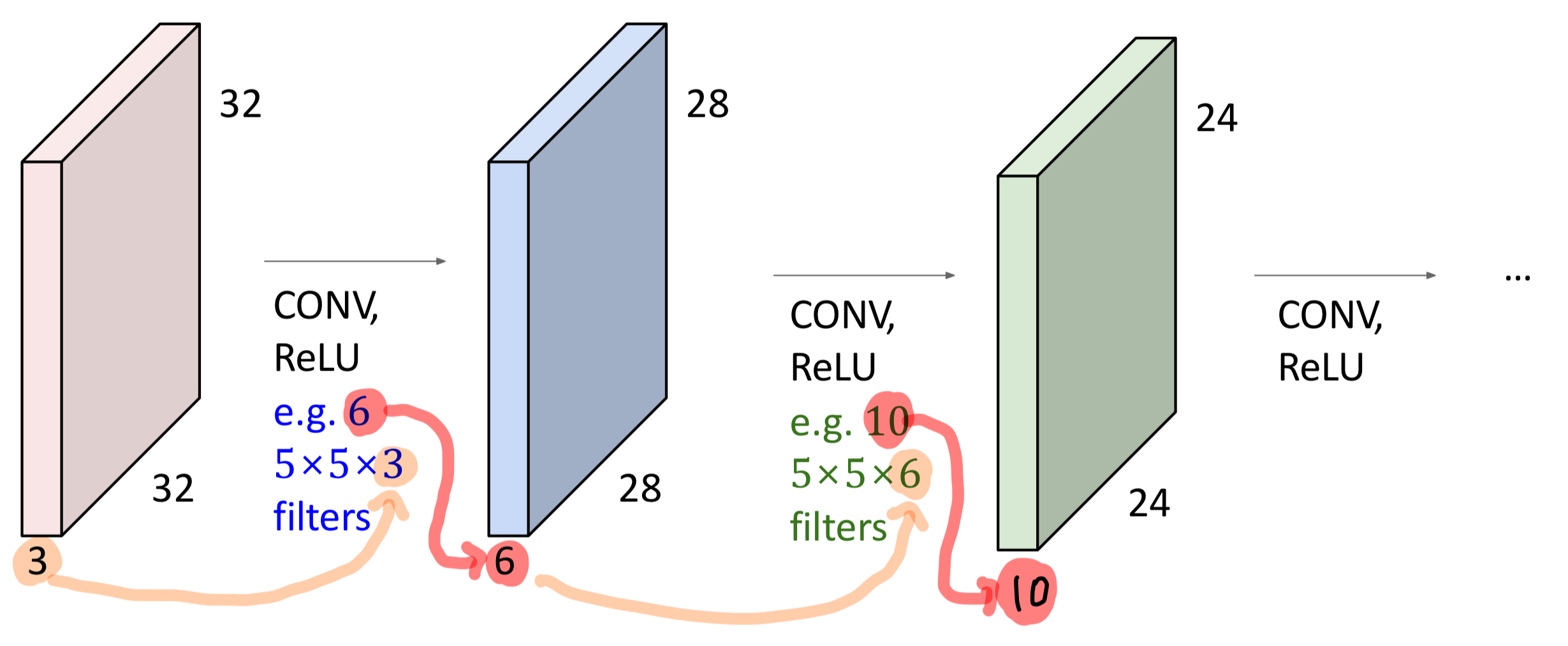이를 정리하자면 위의 그림과 같이 입력의 Channel 수는 Filter의 Channel 수와 같다.