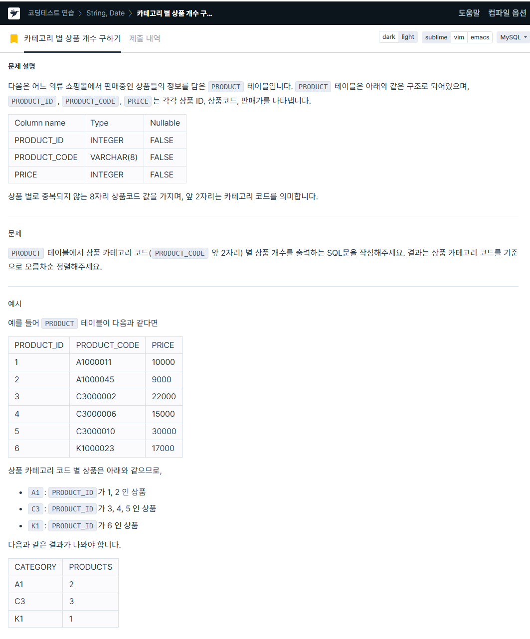SELECT SUBSTRING(product_code, 1, 2) AS CATEGORY, # data 살펴보니 제시된 3개말고 더 있었음