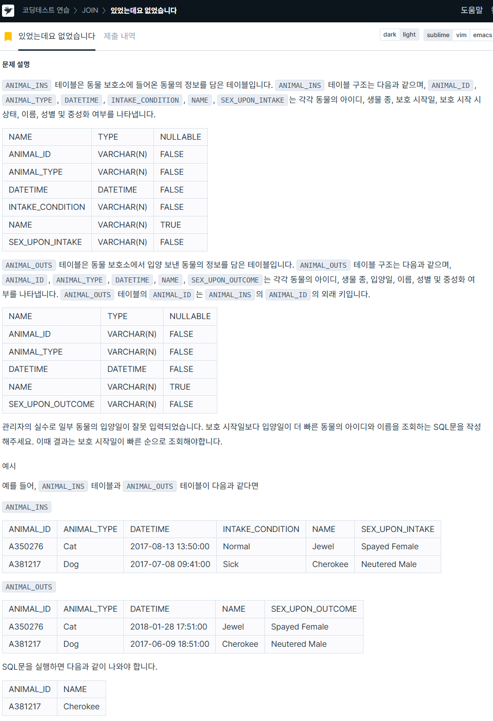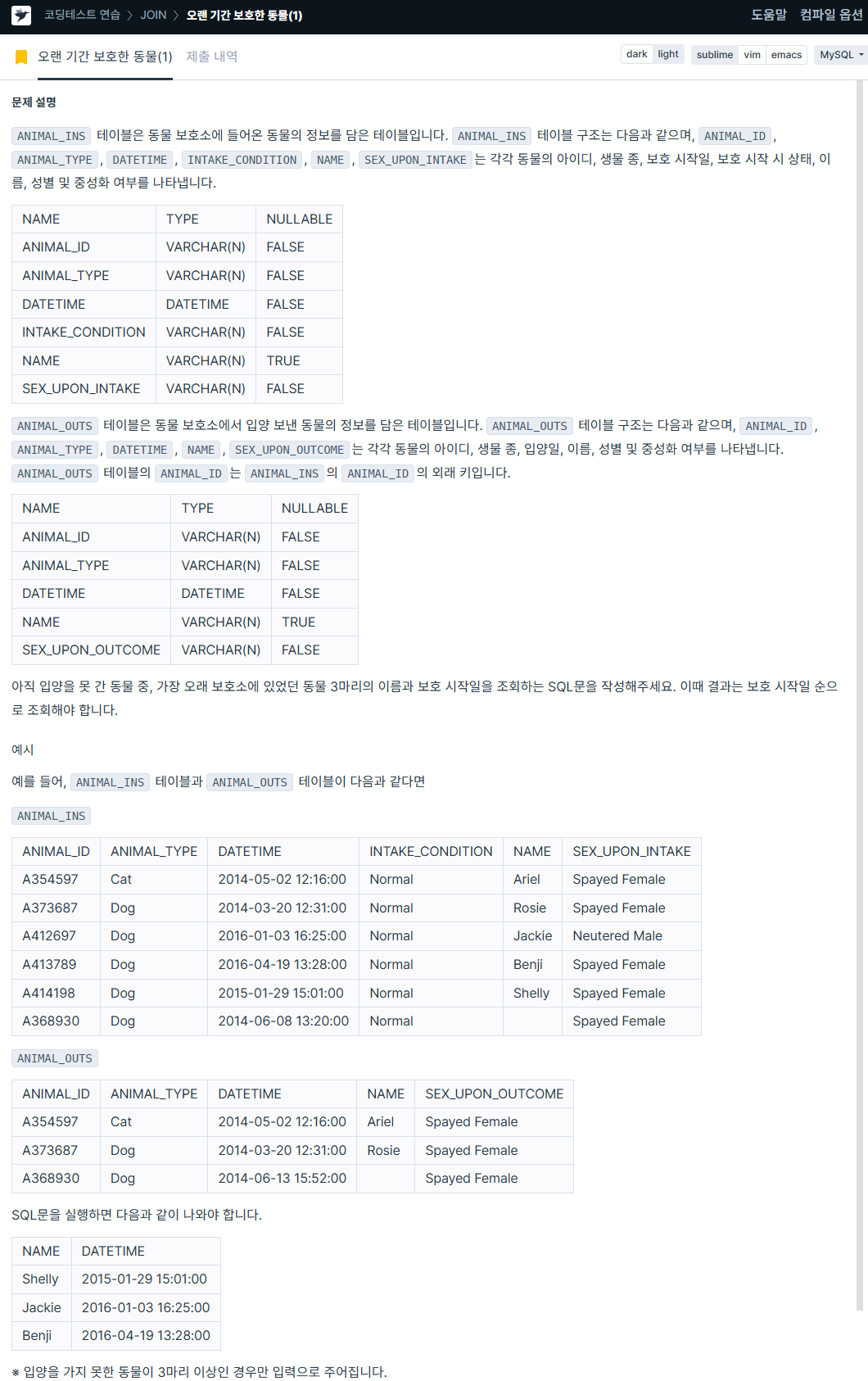 WHERE i.datetime > o.datetime # 보호 시작일 > 입양일 조건 고려 작성
