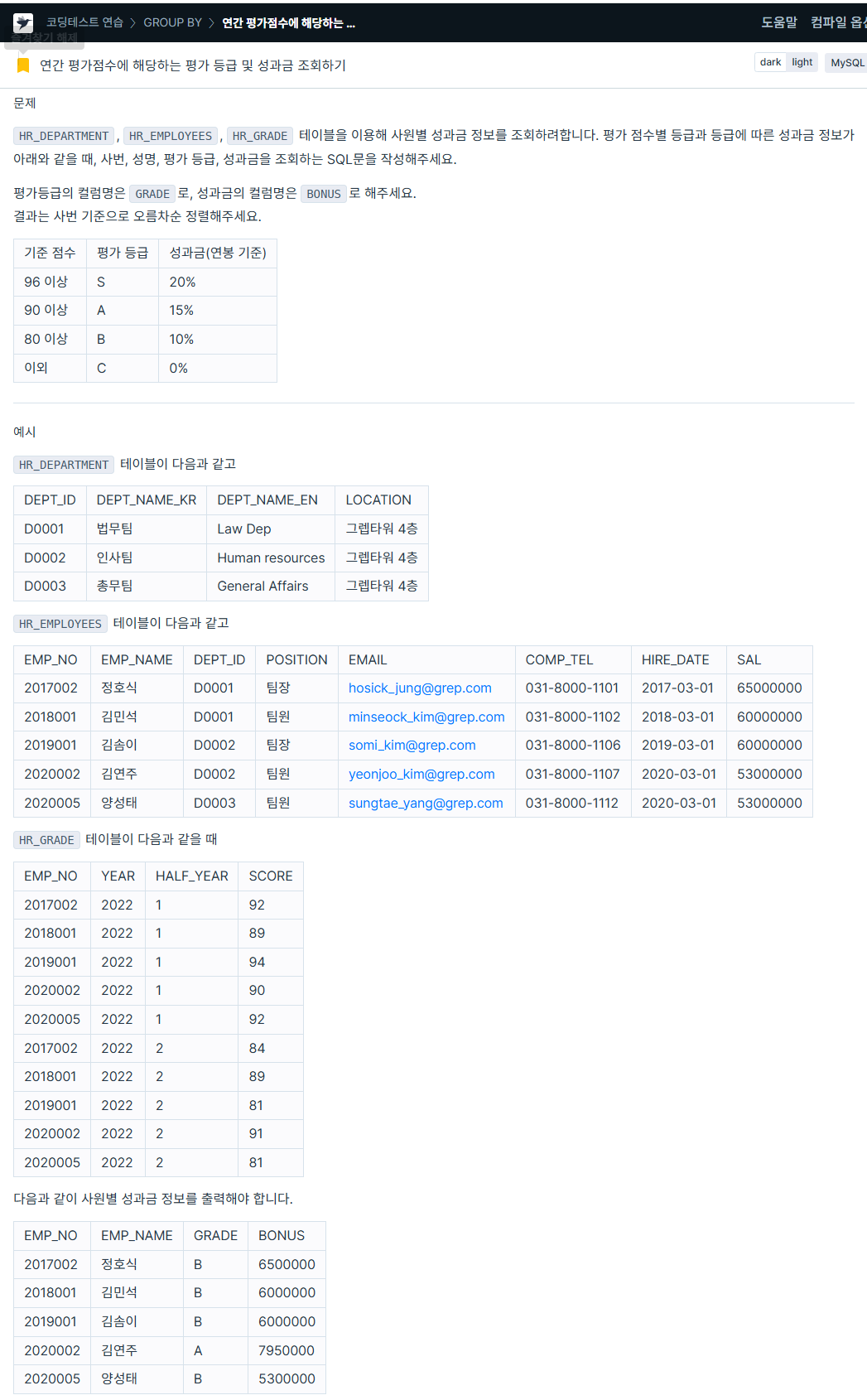 1. subquery에서 grade를 미리 계산, 그런다음 hr_grade와 hr_employees와 join