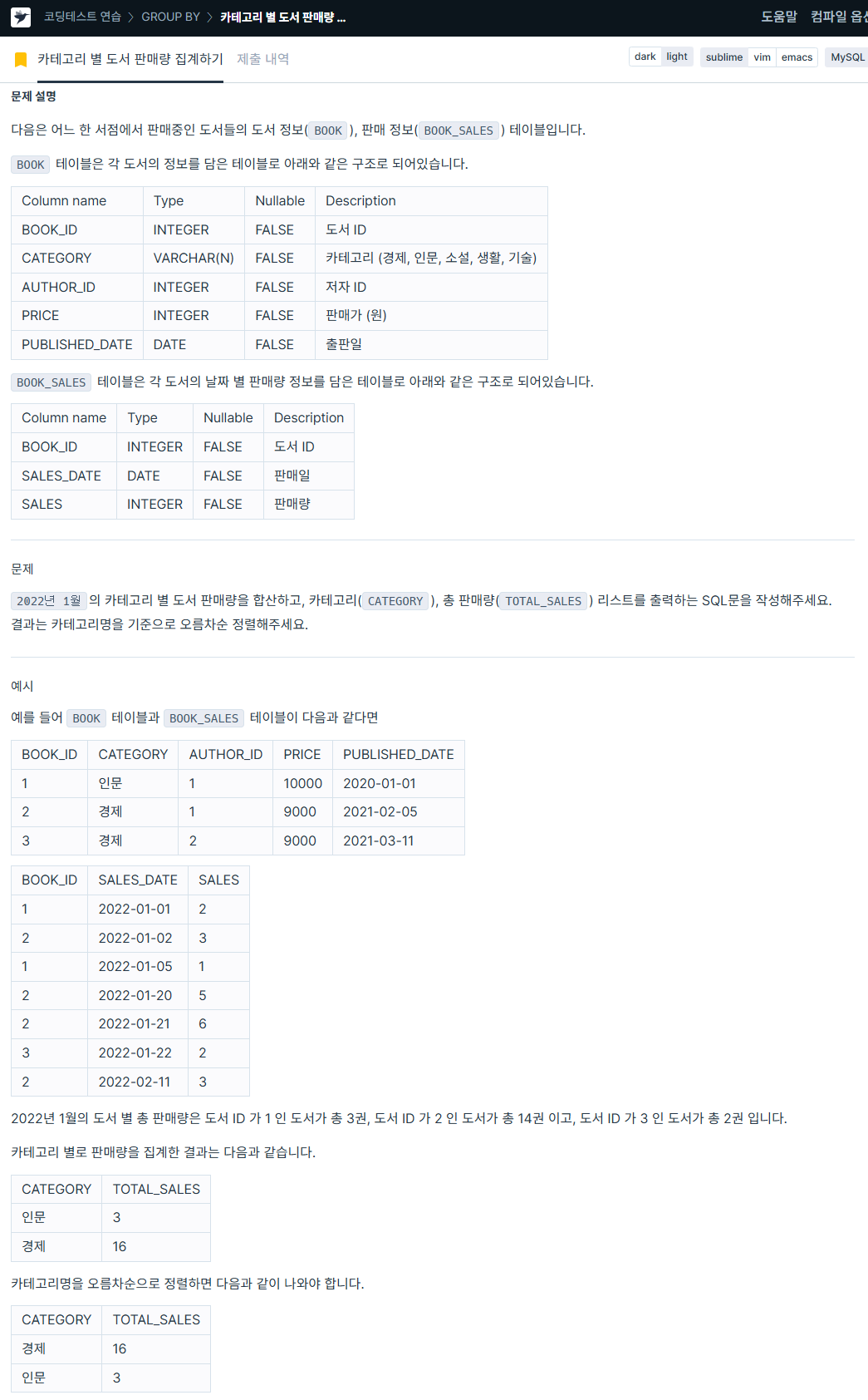 ORDER BY (t.price * t.total_amount) DESC, PRODUCT_CODE ASC; # 총 매출액 내림차순, 상품코드 기준 오름차순 정렬