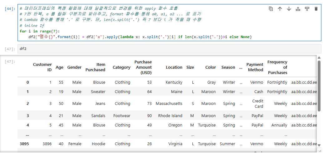 # 7번 반복, a 를 컬럼 구분자로 받아주고, format 함수를 통해 a0, a1, a2 ... 로 표기