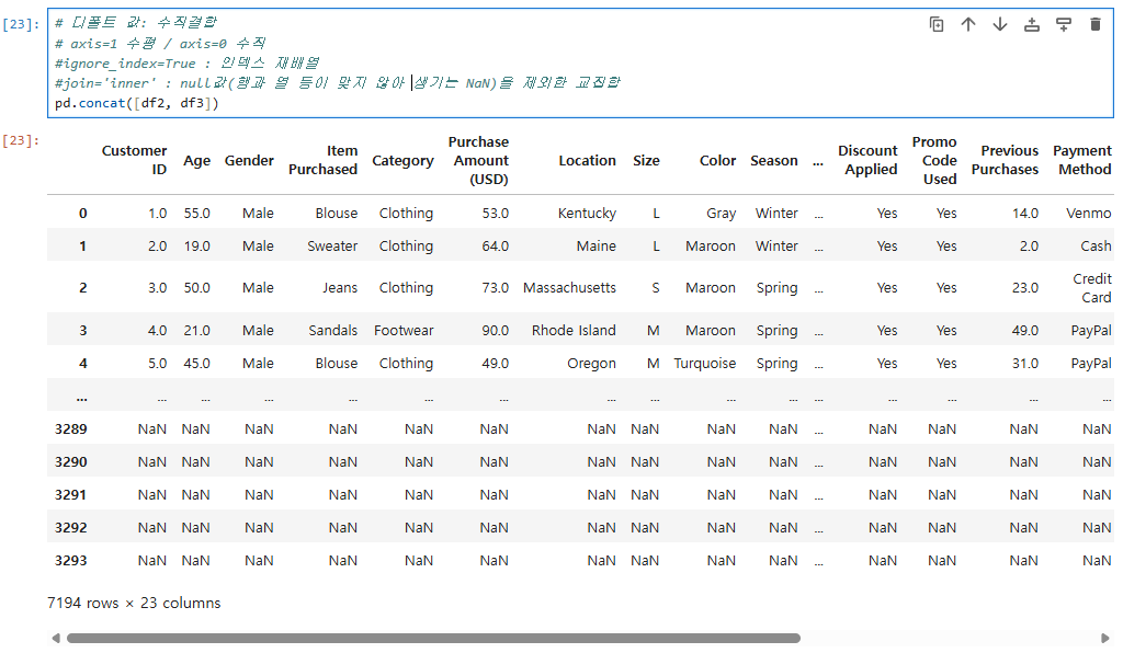 #join='inner' : null값(행과 열 등이 맞지 않아 생기는 NaN)을 제외한 교집합