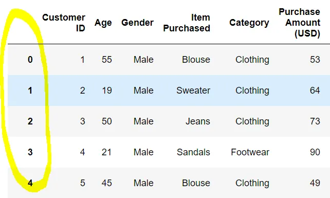 데이터프레임을 보게 되면 노란색 원 영역이 인덱스이다.