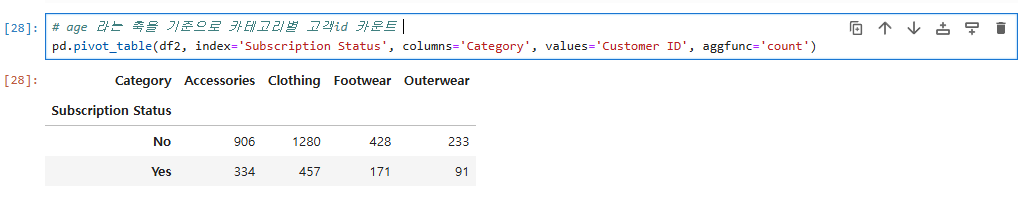 이렇게 age축을 기준으로 카테고리별 고객 id 카운트를 보는 pivot table을 작성할 수 있고,