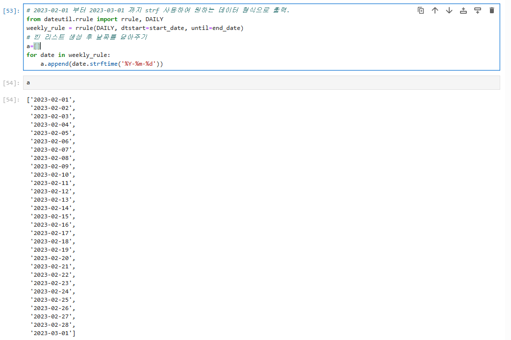 위 코드를 보게 되면 rrule, strftime, append를 이용하여 빈 리스트 생성 후 날짜를 담아준다.
