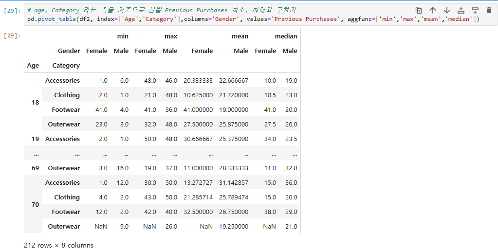 # age, Category 라는 축을 기준으로 성별 Previous Purchases 최소, 최대값 구하기