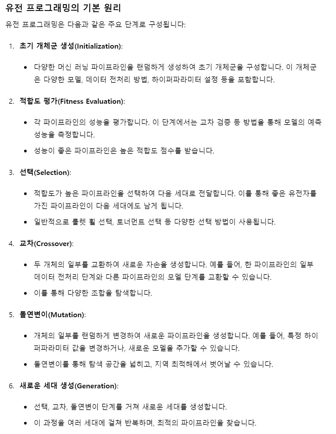 - Genetic Programming: 진화 생물학에서 영감을 받은 최적화 알고리즘으로 자연 선택의 원리를 이용해 최적의 파이프라인을 찾는 방법론.