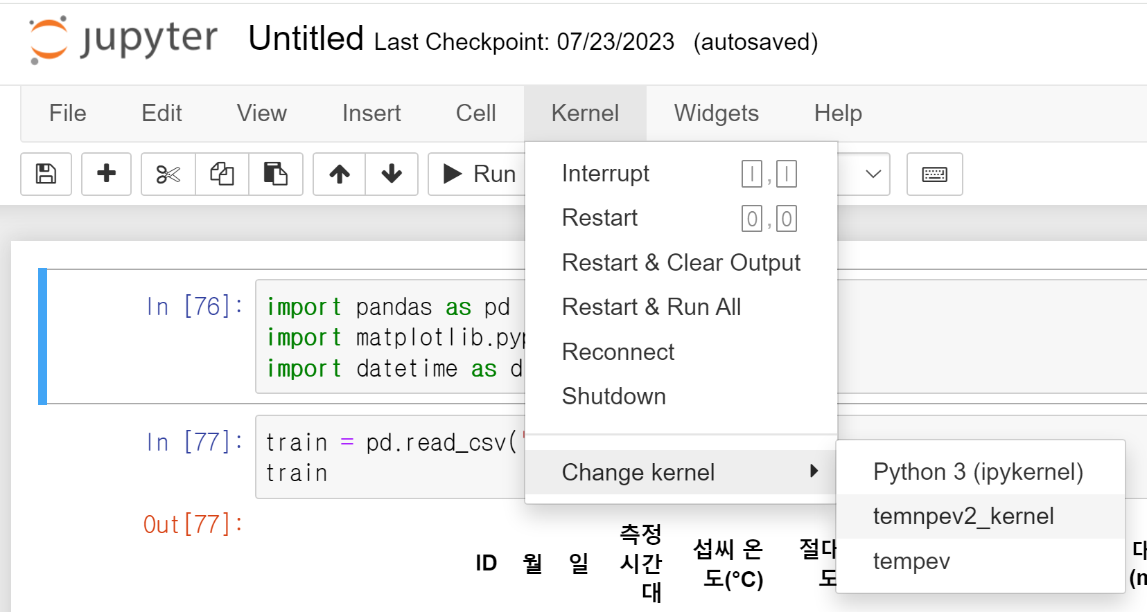 jupyter kernelspec uninstall "커널이름": 커널 삭제