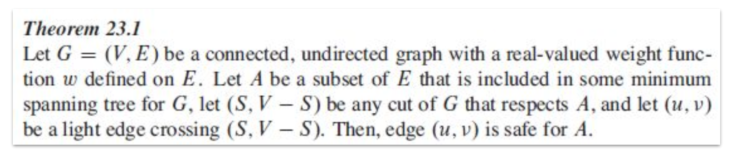 물론 수도 코드이기에 간단하지만, 실제 어떠한 알고리즘을 적용해야 하는 부분이 바로 line 3의 “find safe edge”이다. 안전 간선을 찾는 것은 다음과 같은 정리에 의해 얻어진다. 아래 정리를 이해하기 위해 절단(cut) 의 개념을 이해해야 한다. 무방향 그래프의 cut 는 의 분할을 의미한다. 이때 어떤 edge 에서 혹은 가 에 있고, 나머지는 에 있다면, 해당 edge는 “cut을 교차(cross)한다” 라고 한다. 만약 에 cut을 cross하는 edge가 없다면, cut은 edge의 집합인 를 respect한다고 한다. 그리고 cut을 cross하는 edge들 중에 가중치가 최소인 edge를 경량 간선(light edge)라 한다.
