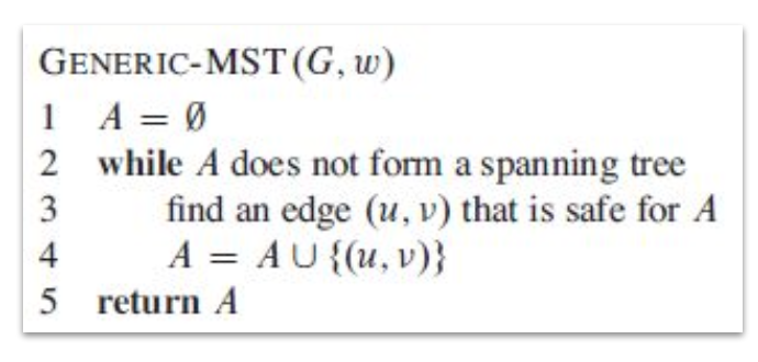 가중치 함수 을 갖는 무방향 그래프 가 있고, 의 최소 신장 트리를 찾는 방법 중 “일반적인(Generic)” 방법을 먼저 알아보자. 이 일반적인 방법은 우선 edge의 집합인 를 이용한다. greedy 방법을 이용하여 반복문을 돌며 에 edge를 추가해나간다. 각 단계마다 는 MST의 부분 집합이 된다. 추가되는 edge가 일 때, 도 MST의 부분 집합이 되도록하며 루프 불변성을 유지하게 한다. 루프 불변성을 유지하게끔 추가되는 edge를 안전 간선(safe edge)이라 한다. 유지되는 루프 불변성은 아래와 같을 것이다.