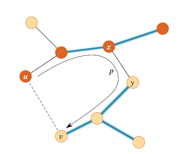 를 의 MST에 포함되는 의 부분 집합이라고 하자. 그리고 는 를 respect하는 의 cut이고 를 cut을 cross하는 light edge라고 하자. 그러면 는 에 대한 safe edge가 된다. 이 정리를 증명해보자. 가 를 포함하는 MST라고 하자. 그리고 에 가 포함되지 않는다고 하자. 아래 그림에서 를 제거하고 를 에 포함시켜서 을 만들었다고 하자.