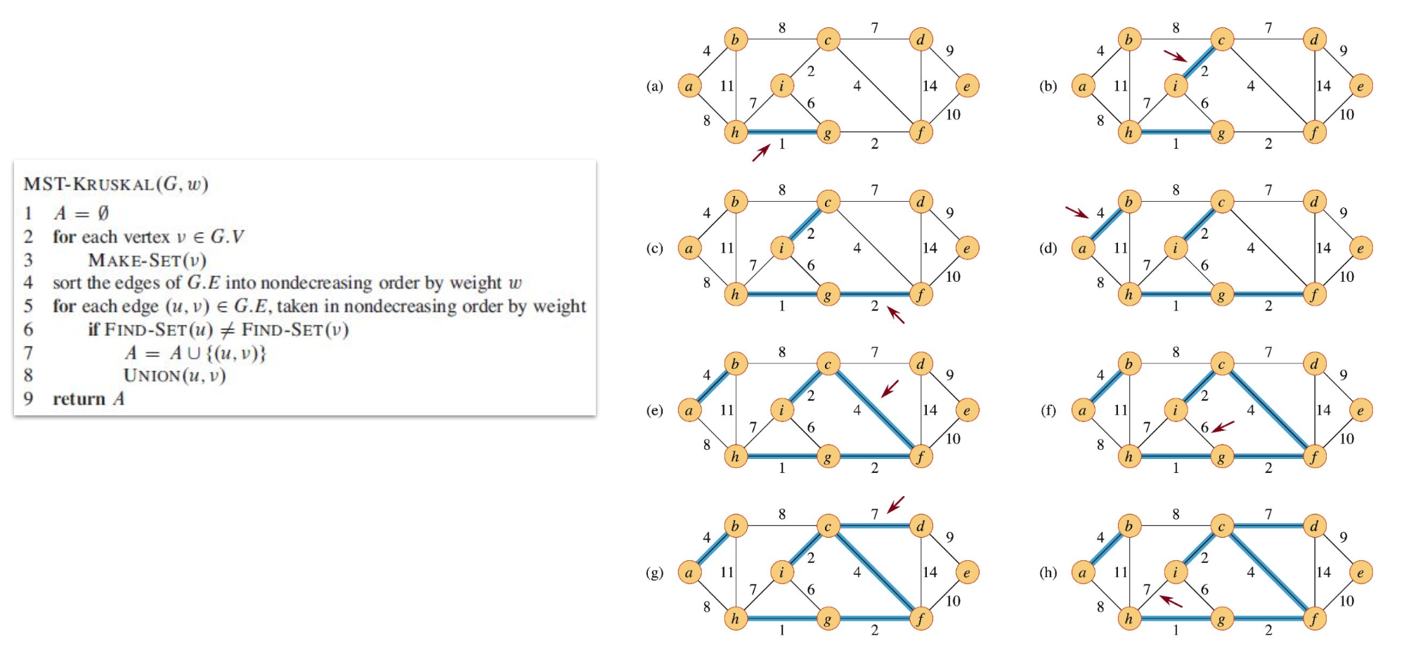 크루스칼 알고리즘은 그래프 의 모든 vertex에 대한 집합(set)을 만든다. 그 후 모든 edge를 가중치 w에 대해 오름차순으로 정렬한다. 그리고 모든 edge에 대해 인지 확인한다. 이는 cycle이 형성되지 않기 위함이다. 해당 조건문을 통과하게 되면 앞에서 이야기한 정리들에 의해 edge는 safe edge가 되고 에 속하게 된다. 그리고 를 실행시켜 같은 집합으로 묶는다. 모든 edge를 탐색한 뒤 를 리턴하면 해당 집합 는 MST가 된다.