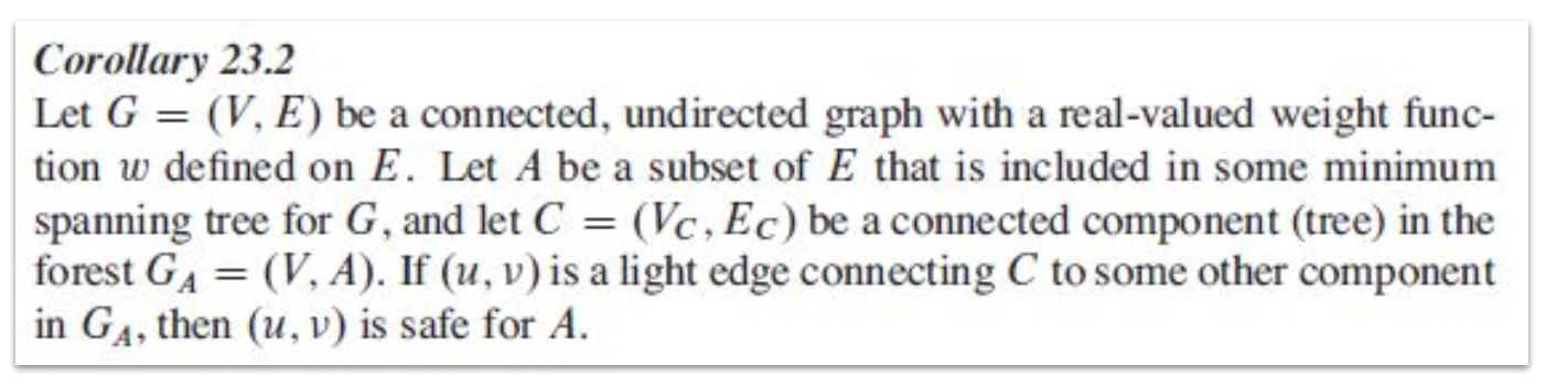 간단하다. 에 있는 하나의 트리인 가 있을 때, edge 가 와 를 cross하는 light edge라면, 는 에 대한 safe edge이다. 이에 대한 증명도 간단하다. cut 는 를 respect하고 가 cut에 대한 light edge이므로, 위의 Theorem 23.1에 의해 는 에 대한 safe edge가 된다.