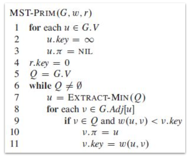 프림 알고리즘은 집합 를 signle tree가 된다. 그리고 에 추가되는 safe edge는 항상 트리에 없는 vertex와 signle tree인 를 연결하는 최소 가중치를 갖는 edge가 된다. 즉, 프림 알고리즘 매 단계마다 가능한 최소값을 갖는 edge를 tree에 추가하는 선택하므로 greedy 알고리즘이라고 볼 수 있다. 프림 알고리즘은 크루스칼 알고리즘과 다르게 항상 single tree가 된다. 즉, root가 되는 node(vertex)가 필요하다. 그리고 매 단계마다 cut을 가로지는 light edge를 찾아야한다. 매 단계의 cut은 가 될 것이다. 여기서 는 에 속하는 vertex로 구성된 집합이 된다. 그렇다면 프림 알고리즘에서 가장 중요한 것은 무엇일까? '어떻게 빠르게 light edge를 찾는가' 이다. 해결책으로 프림 알고리즘에서는 우선 순위 큐(priority queue)를 사용한다. 다음과 같은 수도 코드를 살펴보자.