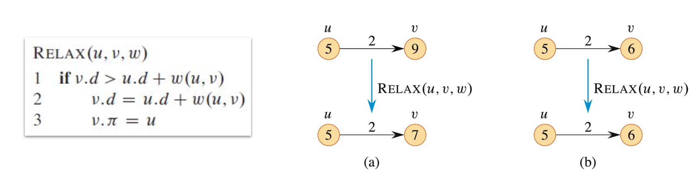수도 코드로는 기존의 v.d 값보다 u.d+w(u,v)의 값이 더 작다면, v.d,v.π를 update한다. relaxation 단계는 shortest-path estimate를 의미하는 v.d의 값을 감소시킨다. 즉, 기존의 경로보다 다른 경로를 거쳤을 때 더 짧은 경로가 있는지 없는지를 확인하는 단계이다.