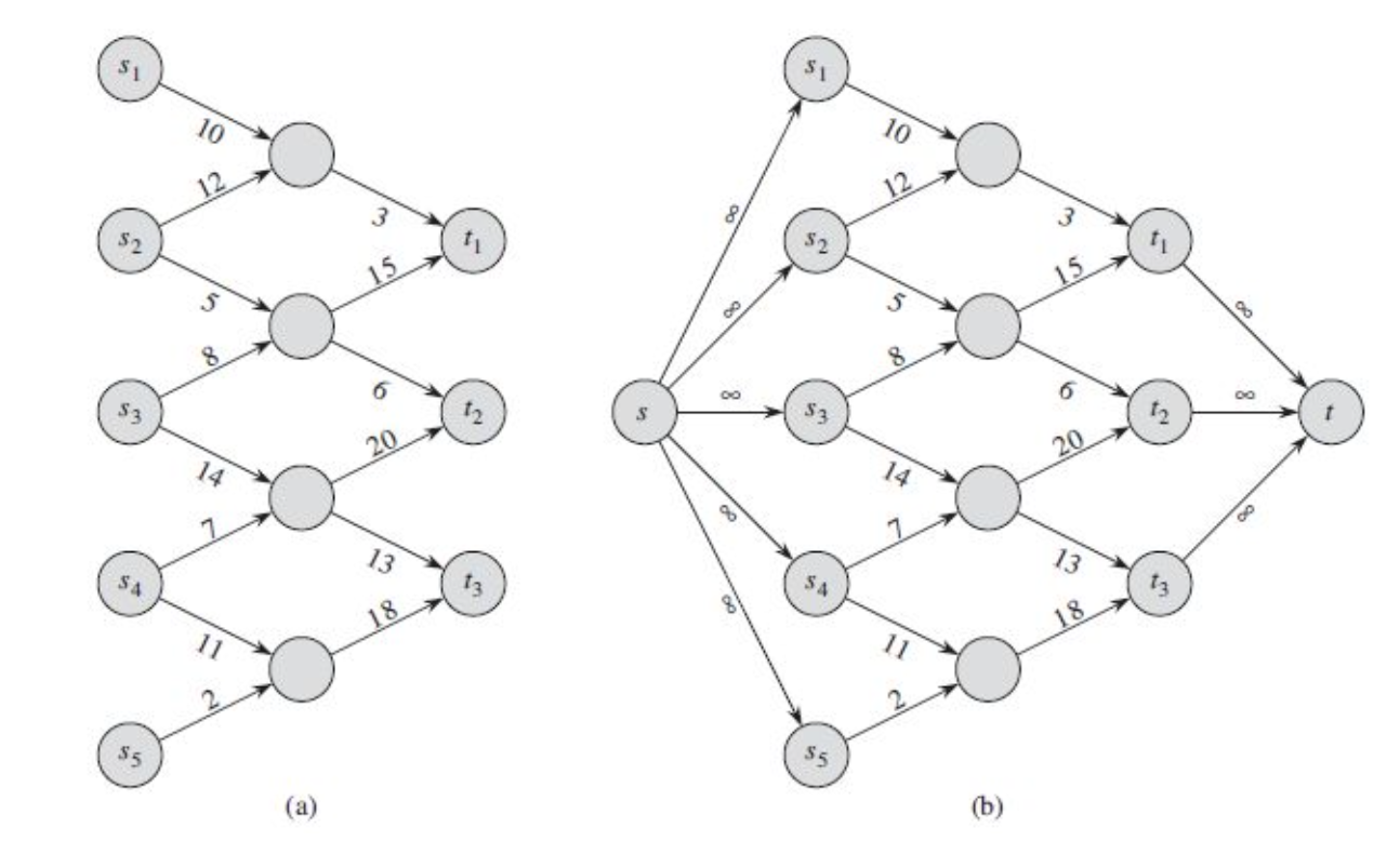 여러개의 source와 sink가 존재하는 flow network에 대해 최대 유량을 구하고자 한다면 어떻게 해야할까? 이는 supersource와 supersink라는 개념을 통해 간단히 일반적인 flow network로 만들 수 있다. 위 그림 (a)를 (b)로 만드는 것이다. supersource를 라고 하고, edge를 추가해주면 된다.