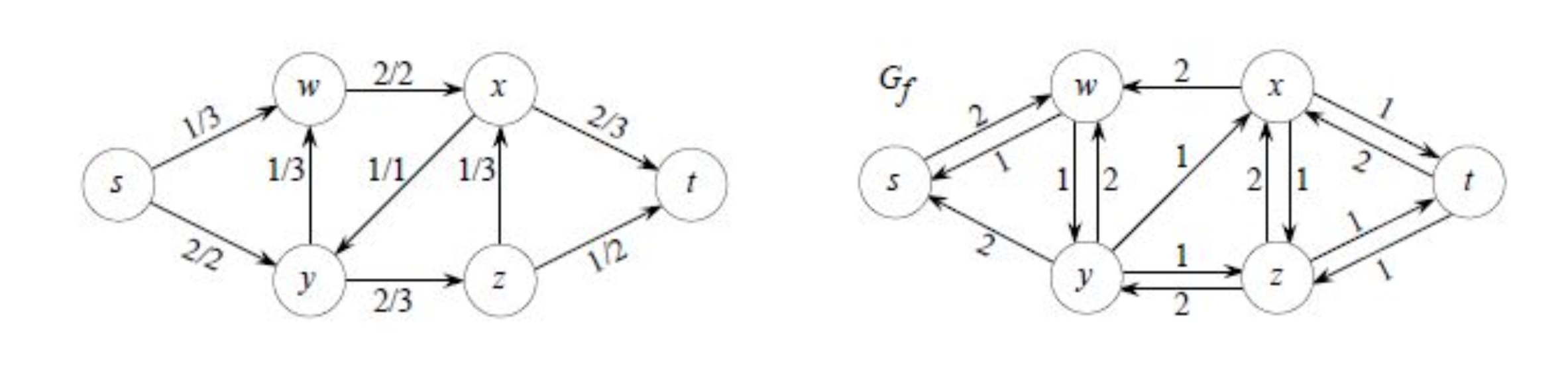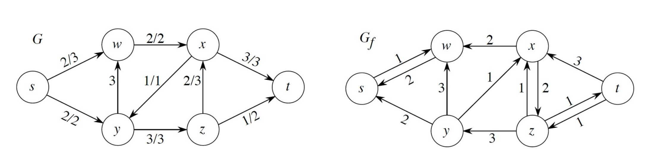 는 이므로 첫번째 case로 가 된다. 는 이므로 두번째 case라 이 된다. 해당 과정을 모든 edge 에 대해 적용하여, 를 구하고 이를 통해 를 그리면 위 그림의 우측 그래프와 같다. residual network로 알 수 있는 점은 기존 그래프의 방향과 동일한 edge에 residual capacity가 존재하면, 해당 양만큼 더 flow를 가할 수 있다는 의미이고, 역방향 edge에 residual capacity가 존재하면, 해당 양만큼 flow를 취소할 수 있다는 의미이다. 아주 중요하다!