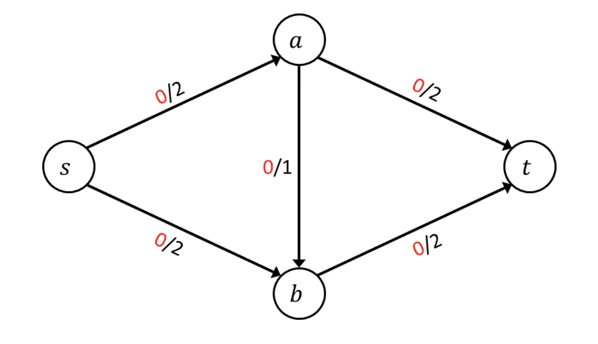 위와 같은 flow network가 주어졌다고 하자. 각 edge마다 얼마의 flow를 흘려보내야 maximum flow가 될까? 우선 의 edge를 지나는 경로로 1만큼의 유량(flow)를 흘려보냈다고 가정하자. 1보다 큰 유량은 에 의해 흘려보낼 수 없다. 그리고 와 로 1씩 더 흘려보낸다고 가정하자. 더 이상 추가할 수 있는 flow가 존재하지 않게된다. 이때의 flow는 3이되는데(에서 출발한 양이 3이므로 flow conservation에 의해 flow network를 흐르는 유량은 3이다.), 이것이 maximum flow일까? 그렇지 않다. 중간에 의 edge를 지나는 경로로 1만큼의 유량(flow)을 보내지 않고, 바로 로 2씩 흘려보낸다면 최대 유량은 4가 된다. 즉, 를 지나갈 이유가 없다. 우리는 사람이기에 잘못된 경로를 찾아내어 수정할 수 있다. 하지만 컴퓨터가 이를 어떻게 연산할까? 잘못된 경로로 flow를 주었을 때 다시 처음으로 돌아가 계산을 해야할까?