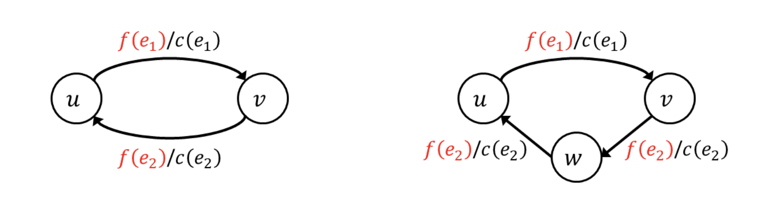 머리(head)와 꼬리(tail)가 동일한 edge를 평행 간선(parallel edge)이라고 한다. 하지만 다음과 같은 과정을 통해 flow network에는 이러한 평행 간선이 존재하지 않는다고 말할 수 있다.