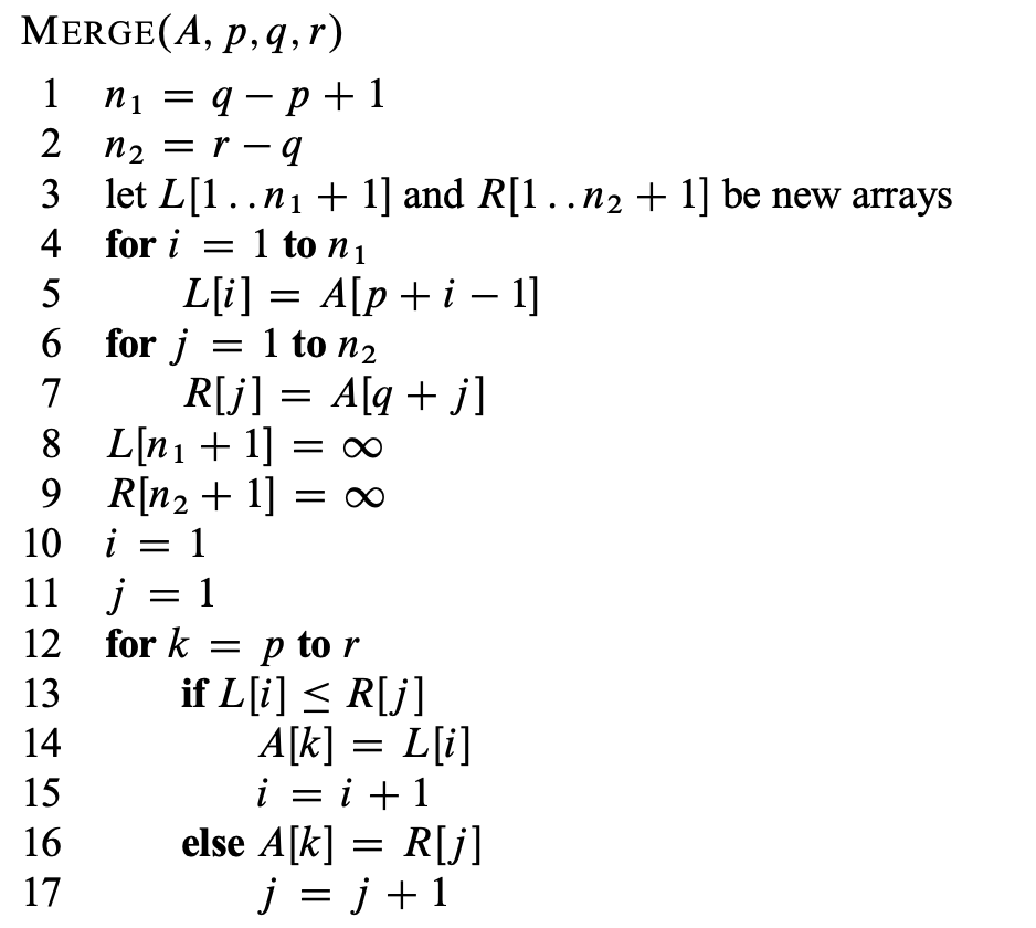 최종적으로 우리는 Merge 알고리즘의 타당성을 증명했다. 총 부터 까지 반복문을 돌면서, 문제의 크기 을 이라 정의하면 Merge는 총 번 수행된다는 것도 알 수 있다. 그렇다면 병합 정렬(Merge Sort)를 아래와 같이 표현할 수 있다.