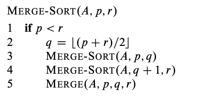 일 때, 즉 크기가 1인 하위 배열이 되면 line3, 4가 더 이상 실행되지 않으면서 위에서 설명한 Recursion bottoms out!되고, Merge과정을 계속 수행하면서 하나의 정렬된 배열을 완성시킨다.