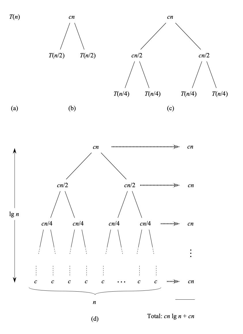 (a)에서 (c)로 가면서 병합 정렬처럼 하나의 문제를 2개로 나누게 된 경우 트리의 구조를 따라 총 연산을 나타낸 것이다. 전체적인 트리가 바로 (d)에 해당한다. (d)를 보면 총 계산시간이 이라는데 이는 왜 그럴까? 문제의 총 갯수를 먼저 살펴보자. 트리의 깊이(=)가 1씩 내려갈 때마다 2배로 늘어나기에 문제의 총 갯수는 라고 할 수 있다. 문제의 총 크기가 이므로 총 개의 크기를 가지는 단계까지 내려가야하는데, 수식으로 정리하면,