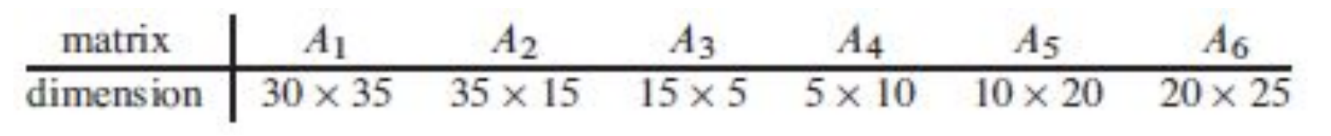 이제 재귀적으로 어떻게 호출할 것인지 결정하자. 어떤 행렬 Ai의 크기를 pi−1×pi라 정의하자. 그리고 DP 기법을 적용하기 위해 이전 연산 결과를 저장하는 배열 m을 정의하고, m[i,j]에는 Ai...j의 최적 연산 횟수(최소 연산 횟수)를 저장한다고 하자. 만약 k,(i≤k≤j)로 나눌 때가 최적이라면, Ai...j의 최소 연산 횟수(m[i,j]에 저장되는 값)는 다음과 같이 정의된다.