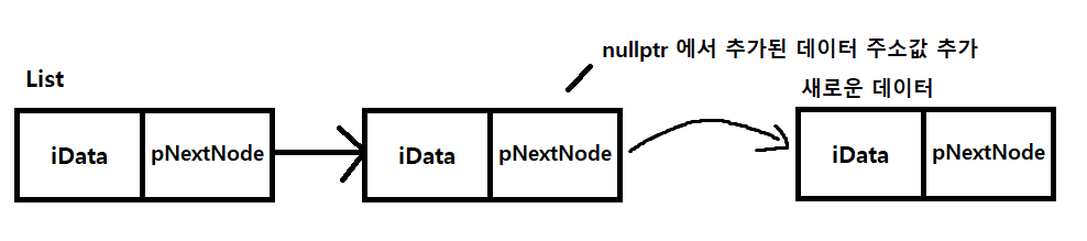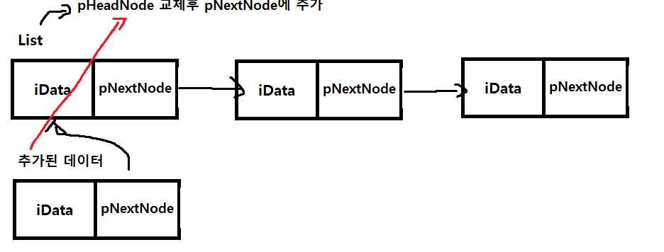 아니라면 헤드 노드 부터 타고 올라가면서 pNextNode 가 nullptr 인곳에 이어서 넣어주고 카운트 하나 추가 한다.