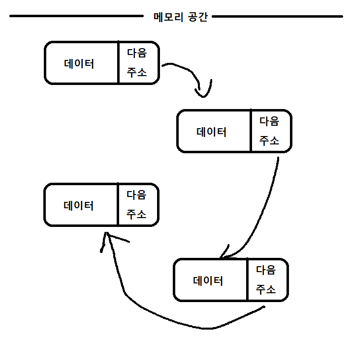 데이터 가 메모리 비어있는 공간에 각각 존재 하고 그 데이터를 다음공간 데이터 주소값을 같이 가지고 있어서 그값을 이용해 찾아간다.