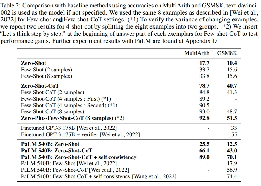 - MultiArith에서는 17.7% 에서 78.7%로 상승, GSM8K에서 10.4%에서 40.7%로 상승