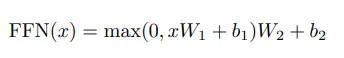 - Position-Wise Fully Connected Feed-Forward Network : 각 위치에 독립적으로 적용되는 비선형 변환.