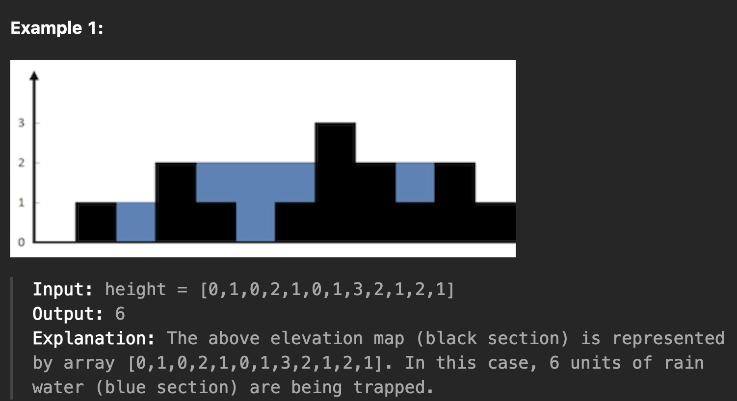 min(left[i], right[i])가 의미하는 건 i 위치에서 왼쪽과 오른쪽으로부터 둘러쌓일 수 있는 높이를 의미한다. 만약 height[i] < min(left[i], right[i]) 이면, 그 차이만큼 물이 고일 수 있다는 의미이다.
