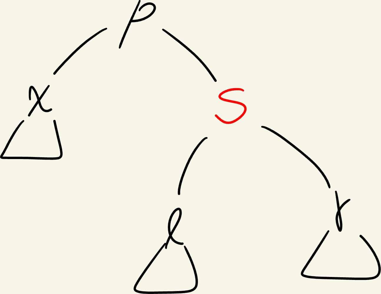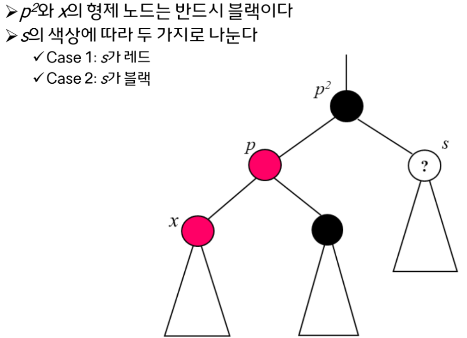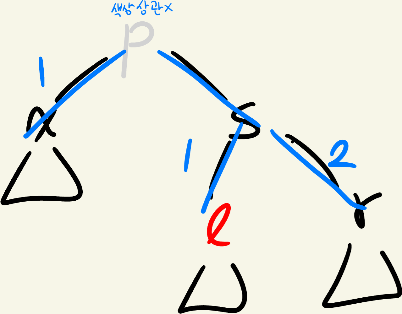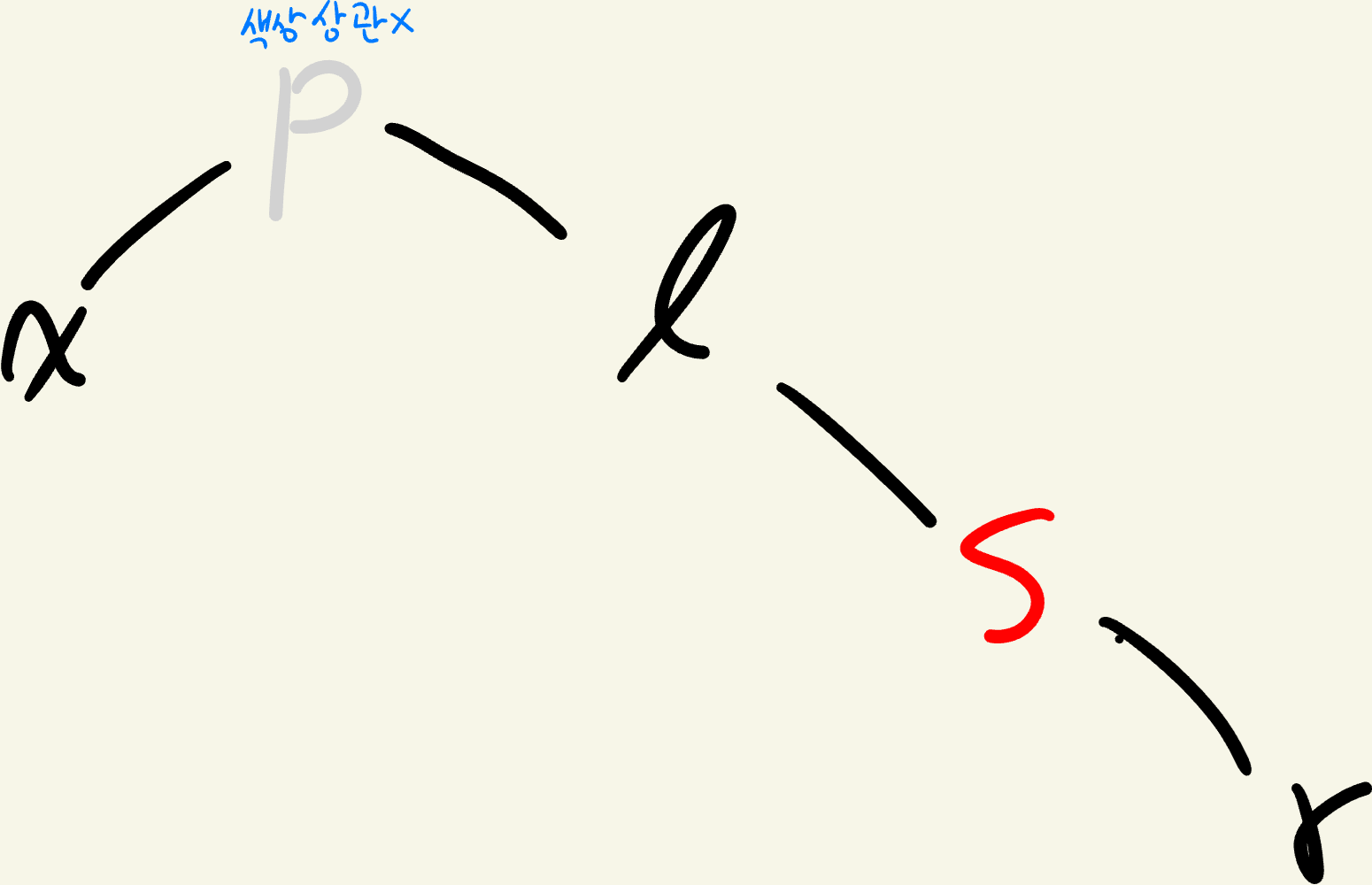 이 문제를 해결하기 위해 주변을 살펴보면, x의 형제 노드 s가 Black, s의 두 자식 l과 r도 모두 Black이다.