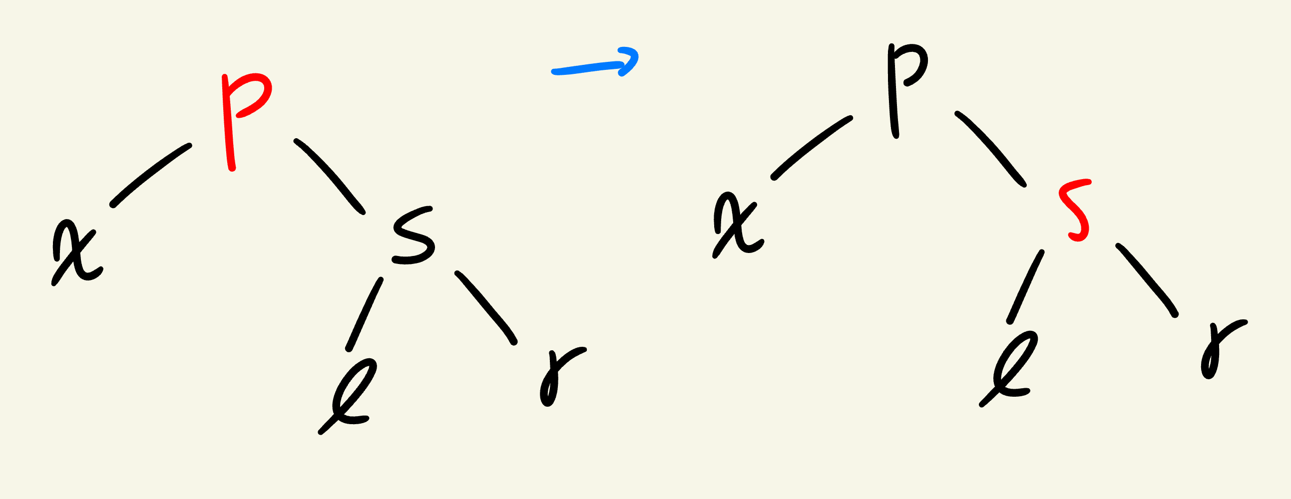 s를 축으로 오른쪽 회전을 하면 l이 s의 자리로 올라오고, s는 l의 오른쪽 자식이 된다.