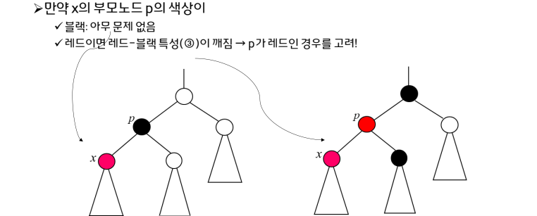 하지만 빨강 노드의 자식 노드는 검정색이다. (빨강 부모, 빨강 자식 불가) 이 특성이 깨지면 복잡해진다.