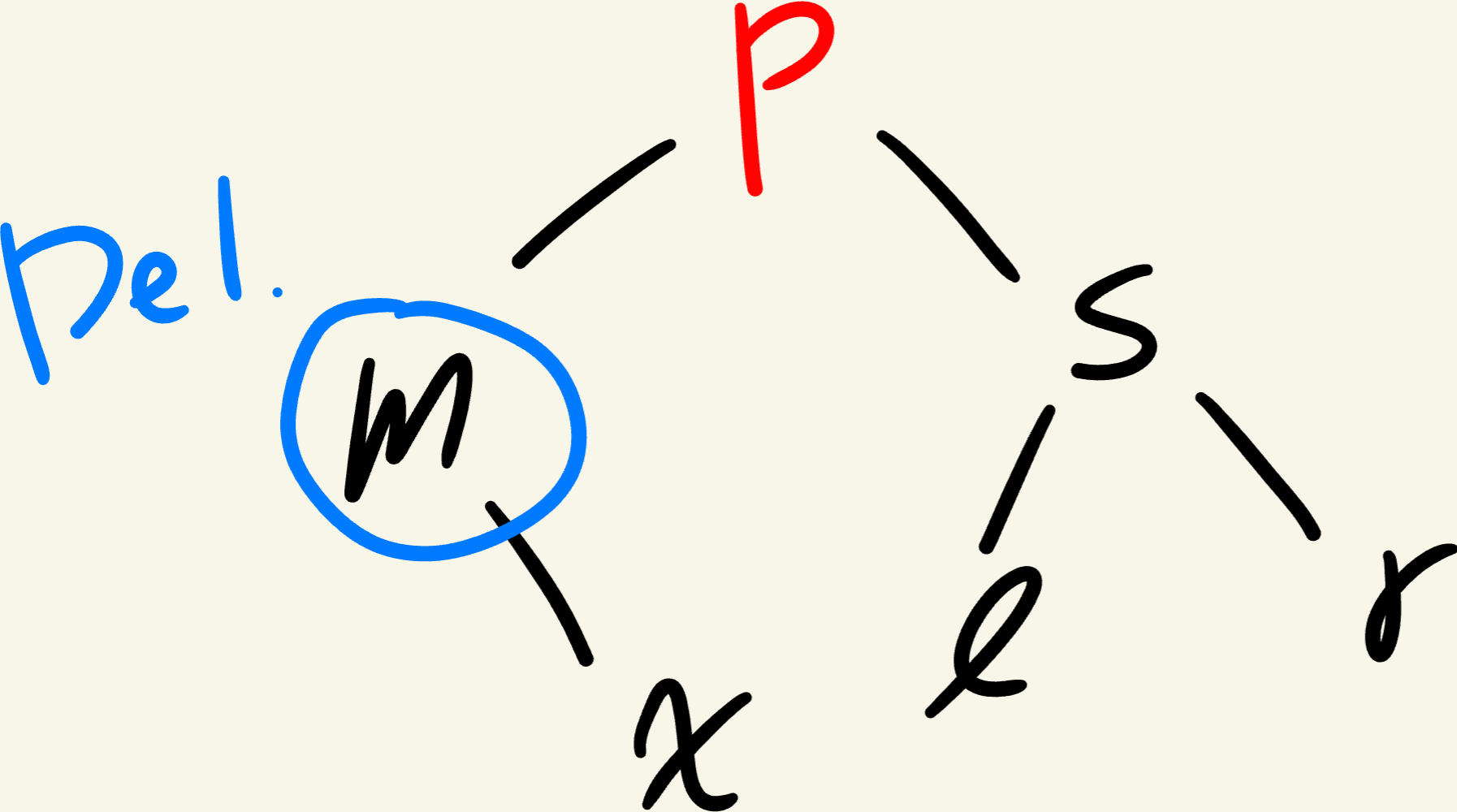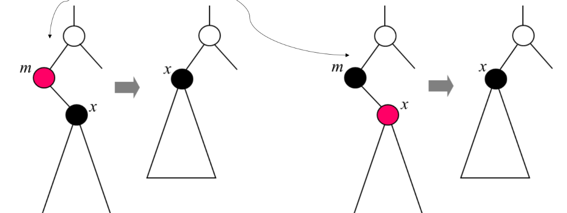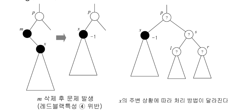 삭제된 노드(m)가 Black이어서, 그 자리를 대체한 x 경로에 Black-Height가 1 부족한 'Double Black' 문제가 발생한다.
