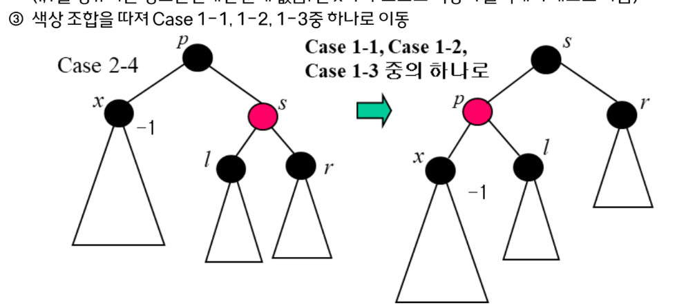 위와 같은 RB-Tree에서 을 삭제하면 에서 왼쪽으로 NIL 노드를 만나러 갈때 만나는 black은 1개이지만,
