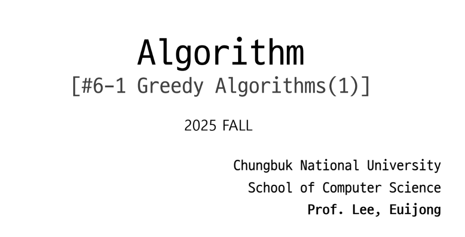 Algorithm [#6-1 Greedy Algorithms(1)] Chungbuk National University School of Computer Science Prof. Lee, Euijong