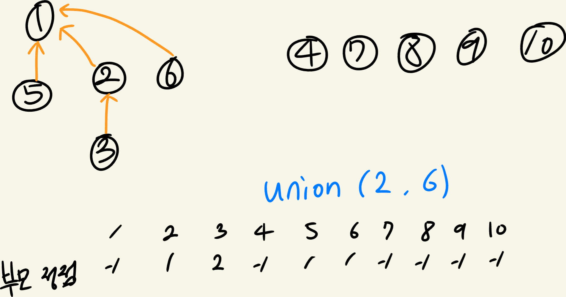 Union(2, 6) 을 진행하면 2에 연결하는 것이 아닌. 2의 부모에 6을 연결한다.