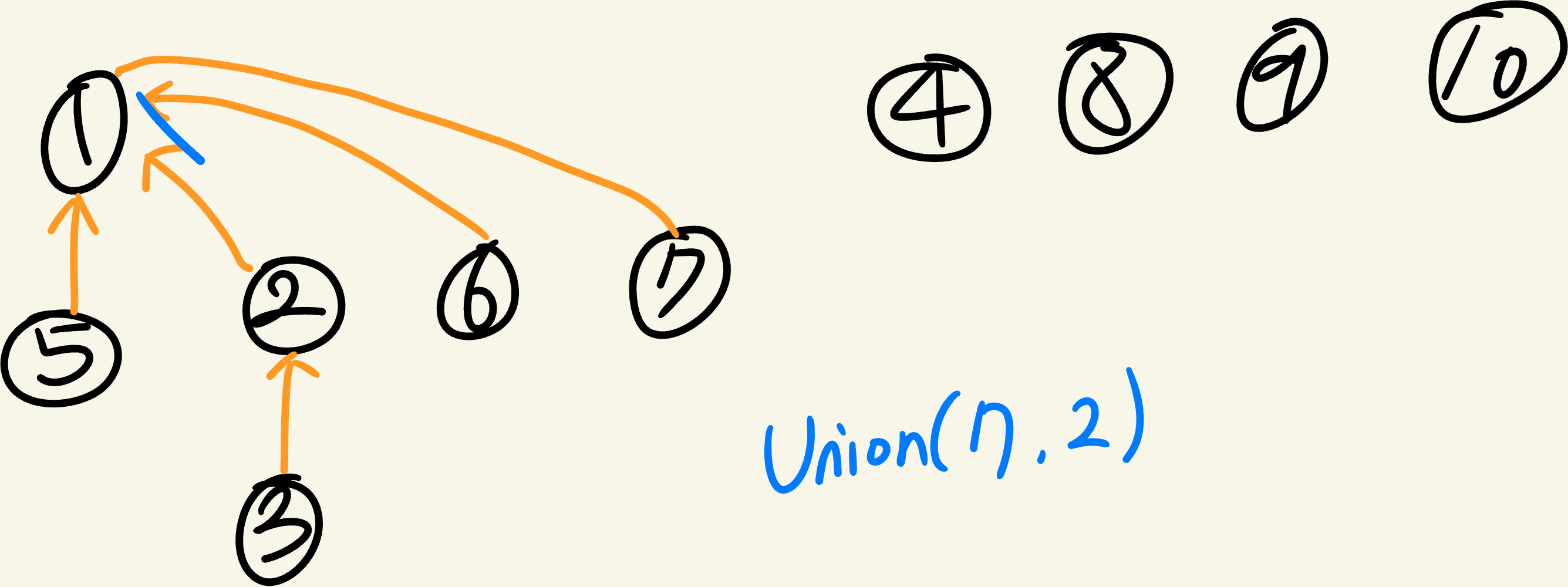 기존 방식대로 Union(7, 2) 를 한다면 2의 부모인 1을 7의 자식으로 만들게 된다.