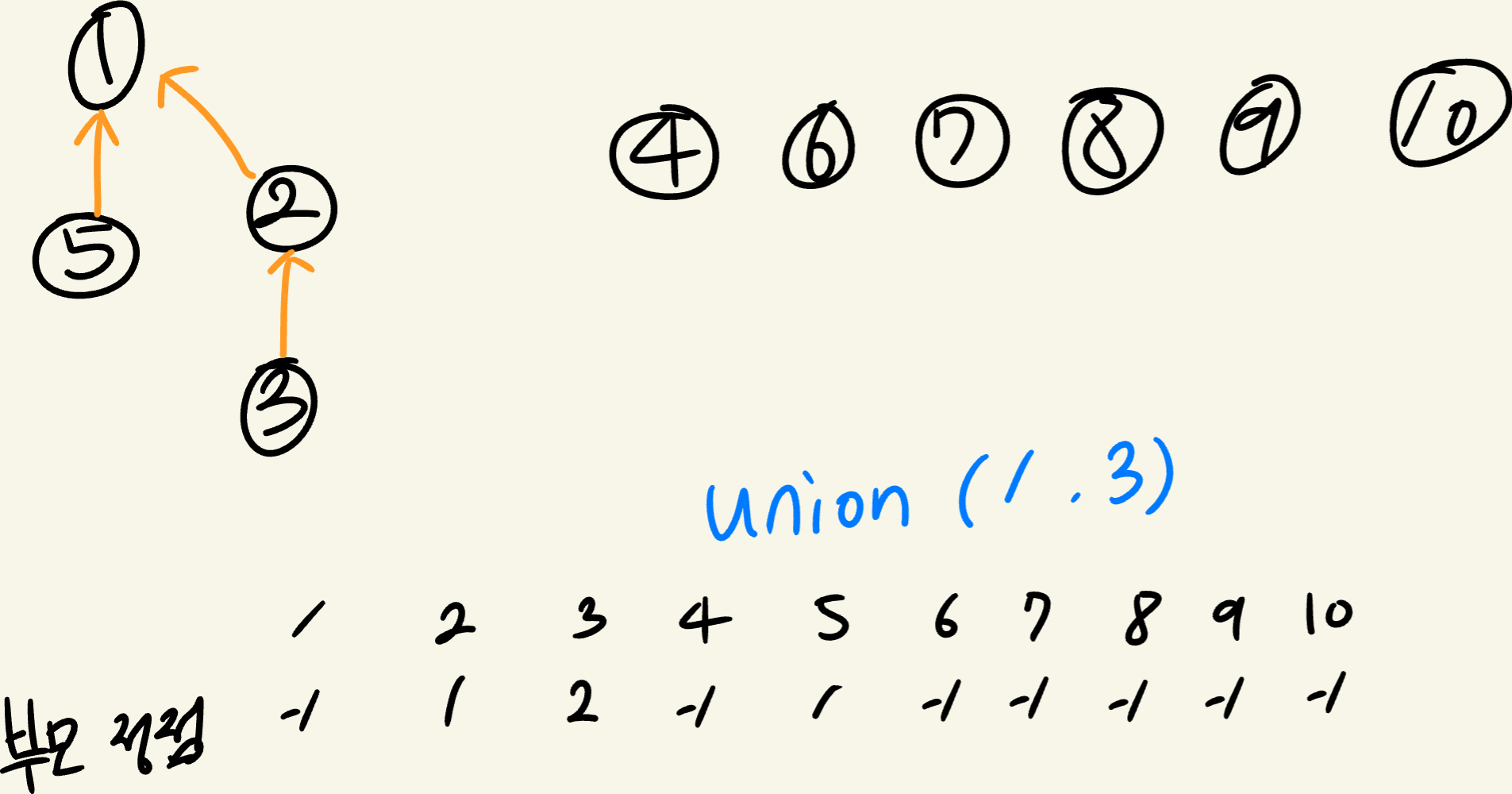 Union(1, 3) 을 하게되면 3을 1에 자식으로 Direct로 연결 하면 2가 버려지니, 2를 1의 자식으로 만들어 그룹이 합쳐지는 방식으로 Union을 한다.