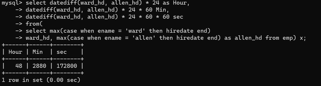 - 그리고 두 날짜의 차이를 day를 기준으로 뽑은 뒤 각 시간의 단위에 따라 곱해서 두 시간의 차이를 다양한 시간, 분, 초 단위로 변화한 쿼리를 뽑았다.