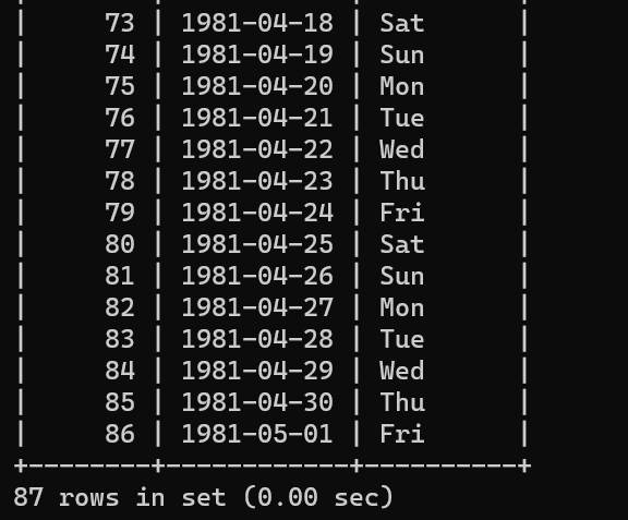 - 이렇게 3개의 컬럼(오름차순 숫자, 더해진 날짜, 날짜의 요일)을 통해