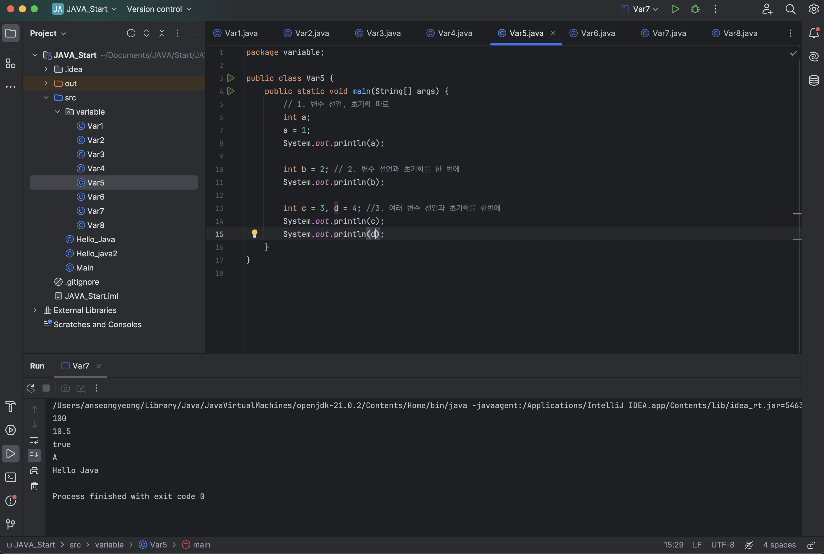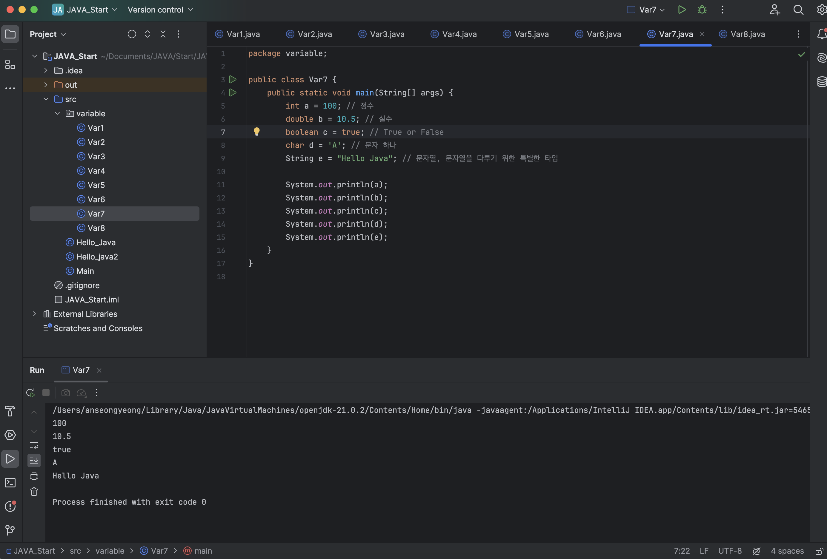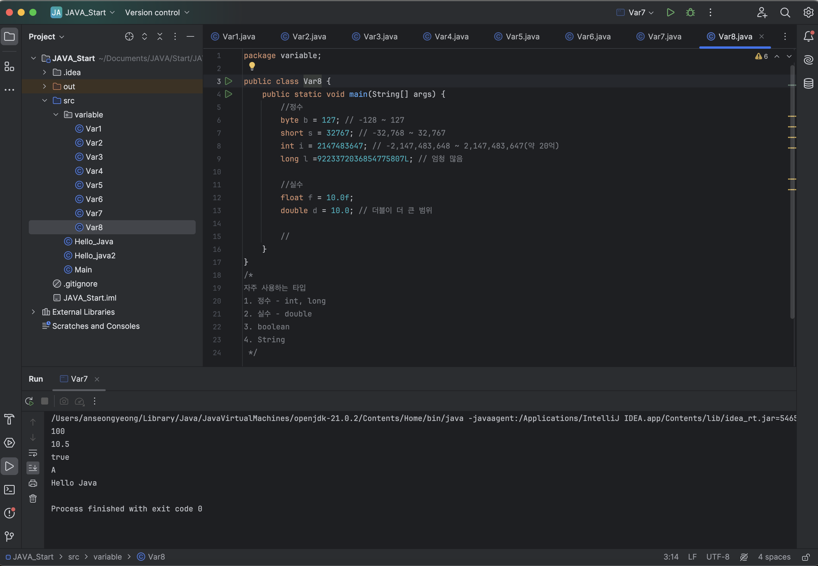 역시 언어의 기본은 변수인데, 파이썬에서는 변수의 타입을 자동적으로 처리해줬다. 근데 어머나 세상에 Java에서는 내가 하나하나 지정을 해줘야한다니 신기했다.