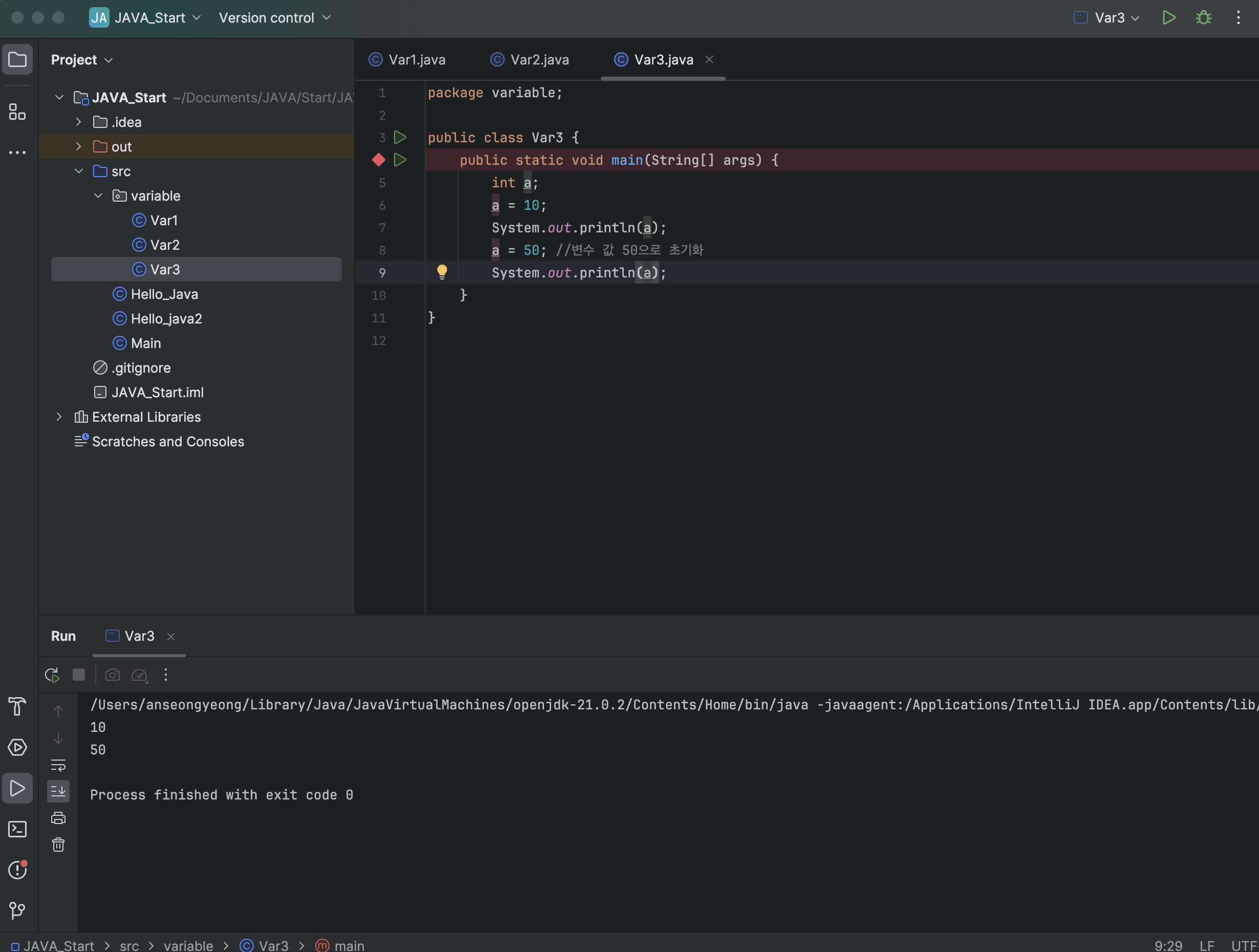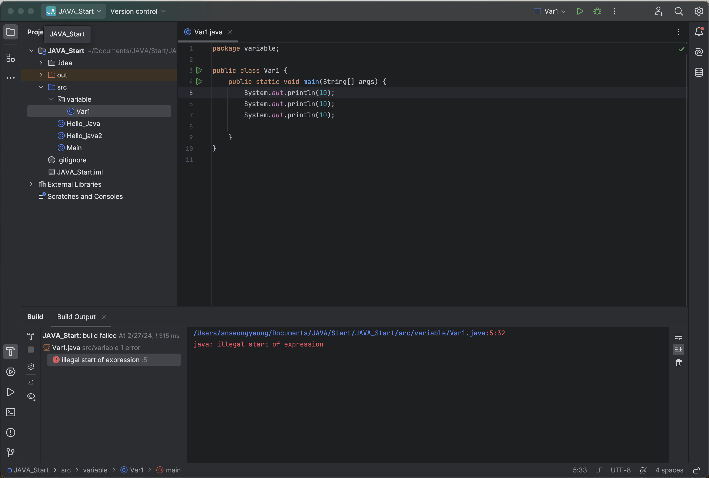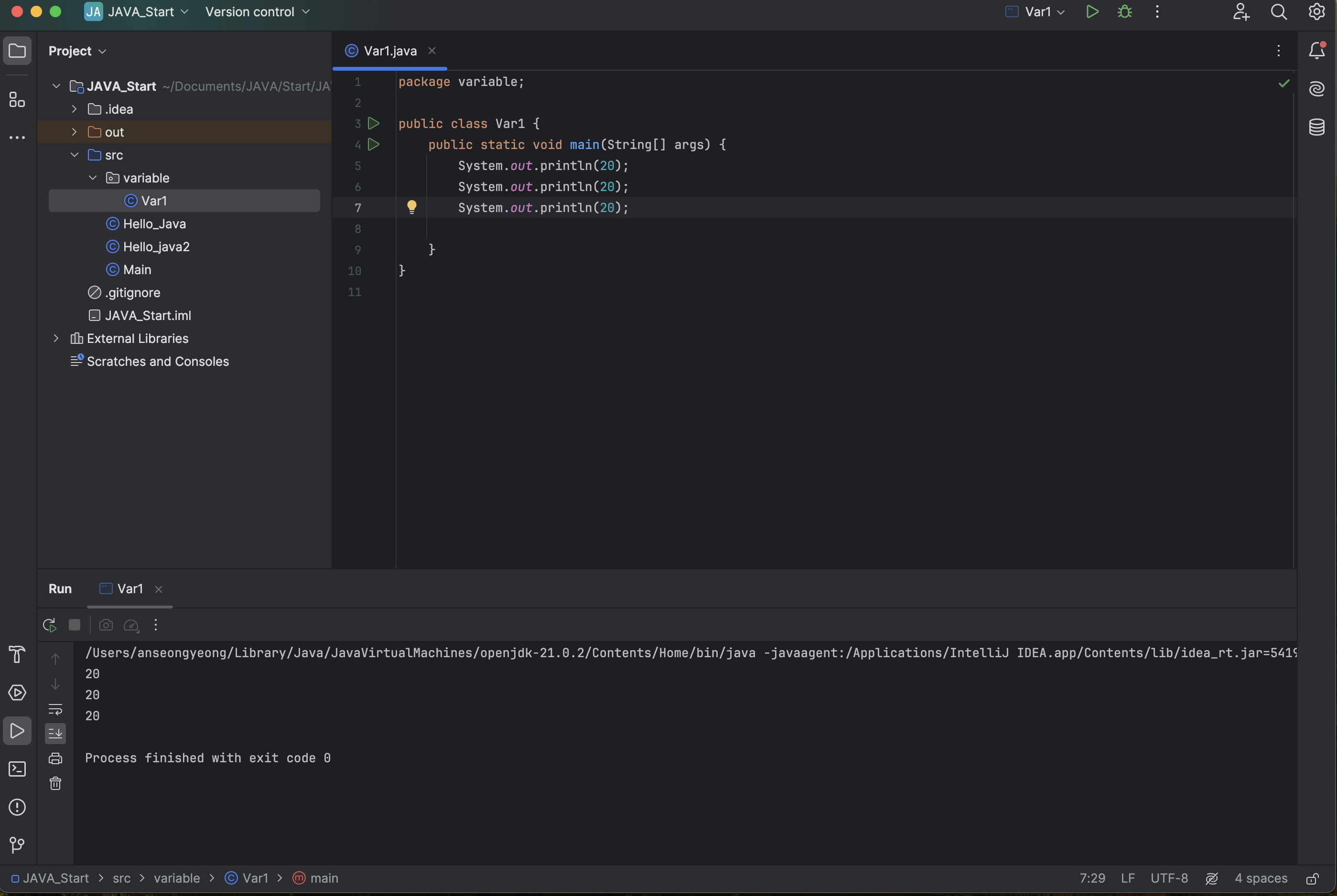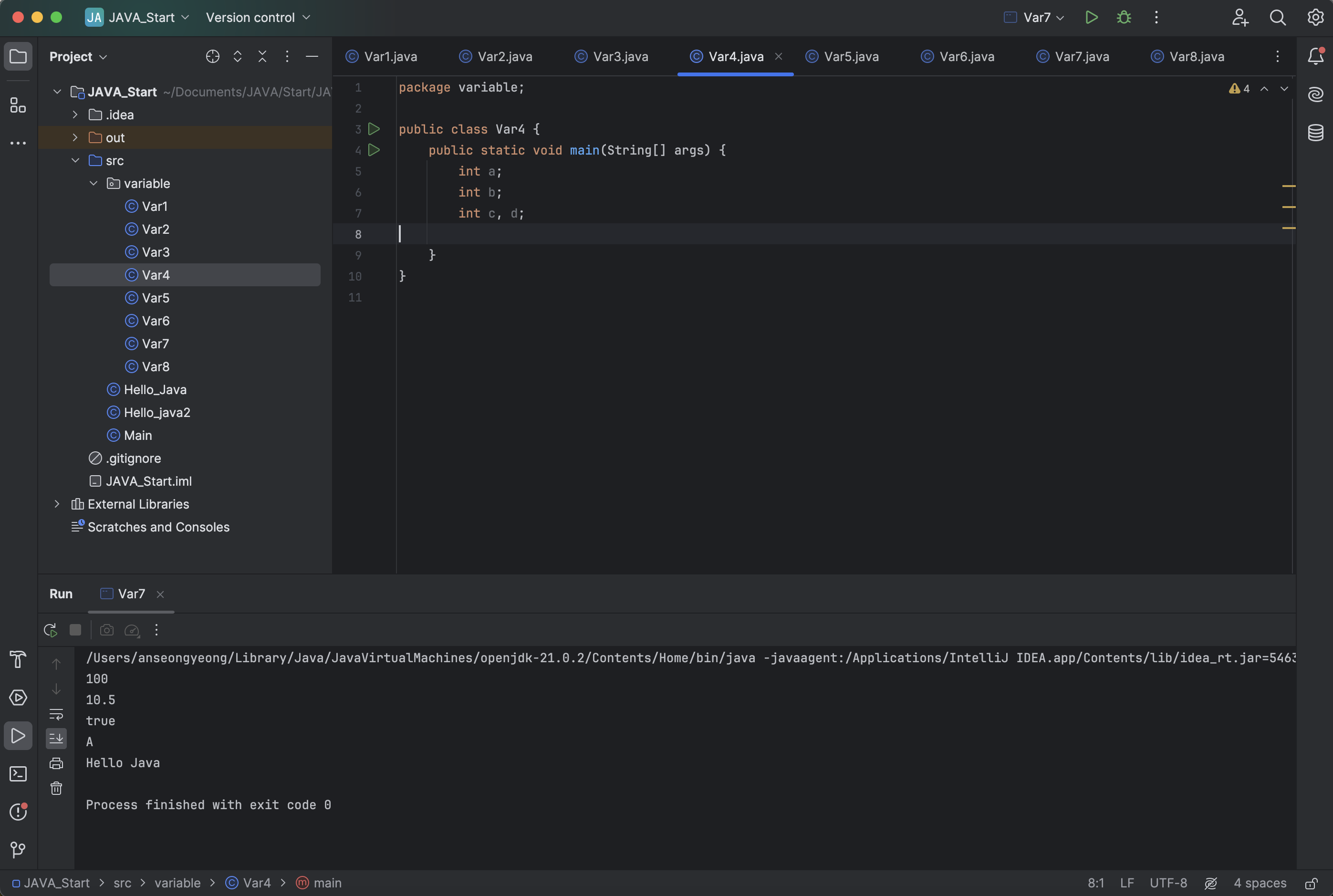 역시 언어의 기본은 변수인데, 파이썬에서는 변수의 타입을 자동적으로 처리해줬다. 근데 어머나 세상에 Java에서는 내가 하나하나 지정을 해줘야한다니 신기했다.